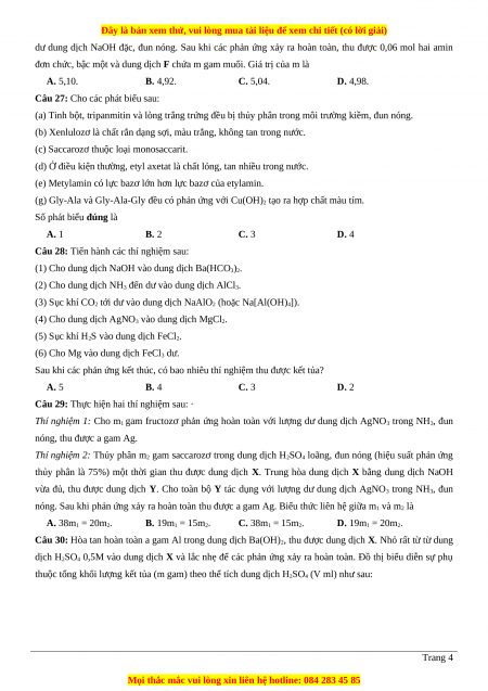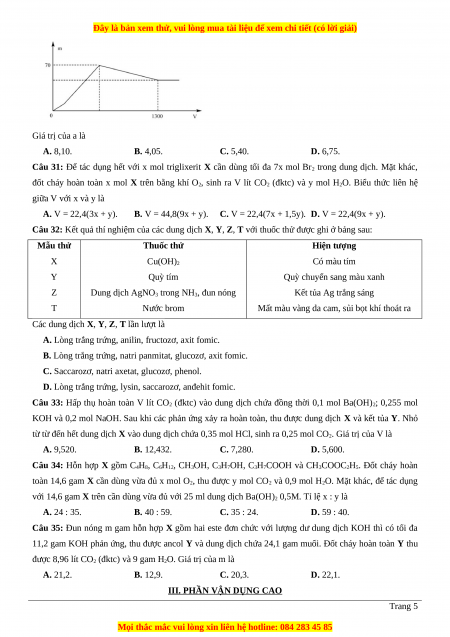 Câu 32: Kết quả thí nghiệm của các dung dịch X, Y, Z, T với thuốc thử được ghi ở bảng sau: Mẫu thử Thuốc thử Hiện tượng X Cu(OH)2 Có màu tím Y Quỳ tím Quỳ chuyển sang màu xanh Z