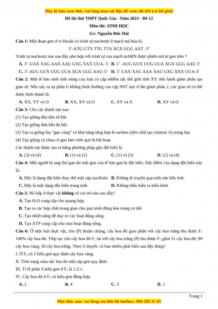 Đề thi thử THPT Quốc Gia - Năm 2023 - Đề 12 Môn thi: SINH HỌC