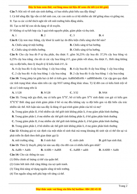 Câu 9: Cho cây hoa đỏ P tự thụ phấn, thu được F1 gồm 56,25% cây hoa đỏ: 37,5% cây hoa hồng và
