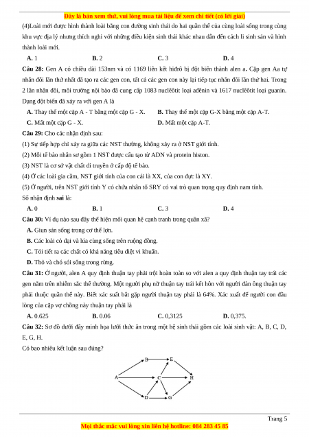 Câu 10: Trong phép lai giữa hai cá thể có kiểu gen: AaBbDdEeHh × aaBBDdeehh. Các cặp gen quy định
