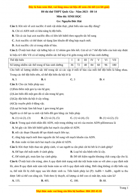 Đề thi thử THPT Quốc Gia - Năm 2023 - Đề 14 Môn thi: SINH HỌC