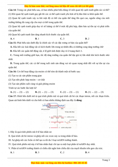 V. Phân tử mARN trưởng thành có chiều dài ngắn hơn chiều dài của mạch khuôn trên gen cấu trúc. A. 1 B. 3 C. 2 D. 4 Trang 3