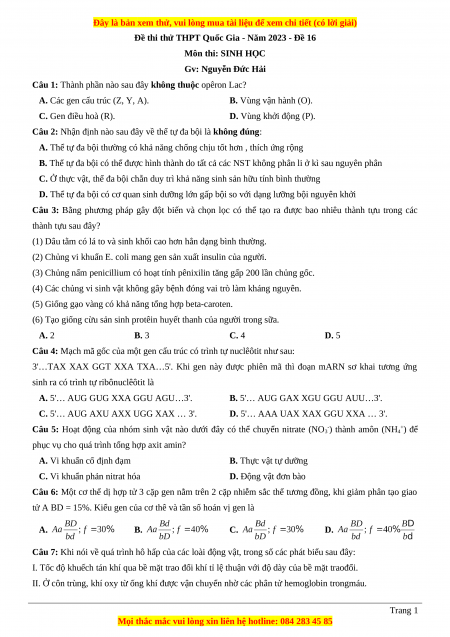 Đề thi thử THPT Quốc Gia - Năm 2023 - Đề 16 Môn thi: SINH HỌC
