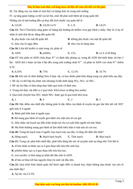 Câu 17: Hai phân tử ADN chứa đoạn N15 có đánh dấu phóng xạ. trong đó ADN thứ nhất được tái bản 3