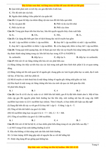 Câu 24: Trong giai đoạn tiến hóa hóa học, bầu khí quyển nguyên thủy chưa xuất hiện