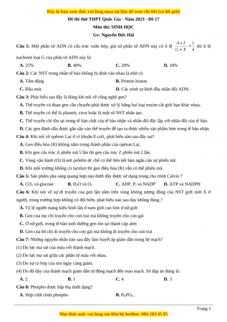 Đề thi thử THPT Quốc Gia - Năm 2023 - Đề 17 Môn thi: SINH HỌC