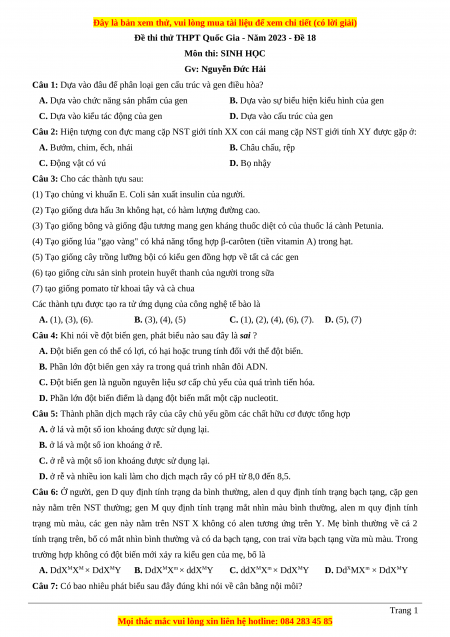 Đề thi thử THPT Quốc Gia - Năm 2023 - Đề 18 Môn thi: SINH HỌC