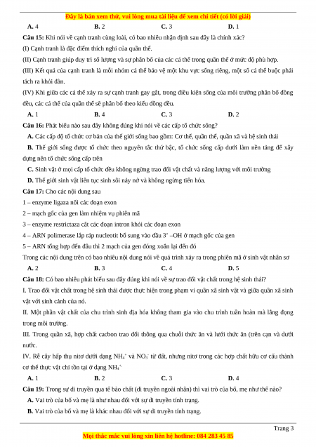 Câu 15: Khi nói về cạnh tranh cùng loài, có bao nhiêu nhận định sau đây là chính xác?