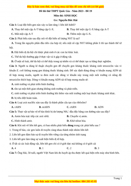 Câu 1: Loại đột biến gen nào xảy ra làm tăng 1 liên kết hiđrô?