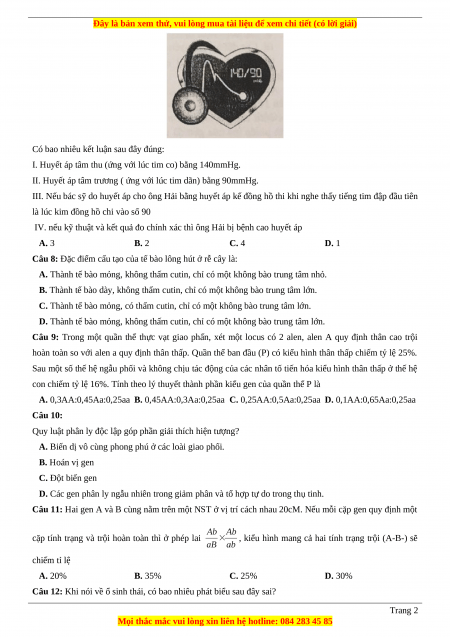 Câu 7: Ông Hải, 50 tuổi, người Việt Nam khi đo huyết áp thu được kết quả hiện trên máy như hình bên. Trang 1