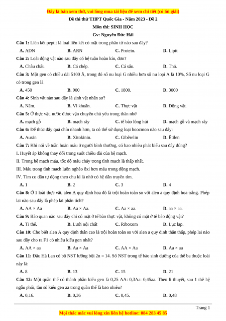 Đề thi thử THPT Quốc Gia - Năm 2023 - Đề 2 Môn thi: SINH HỌC