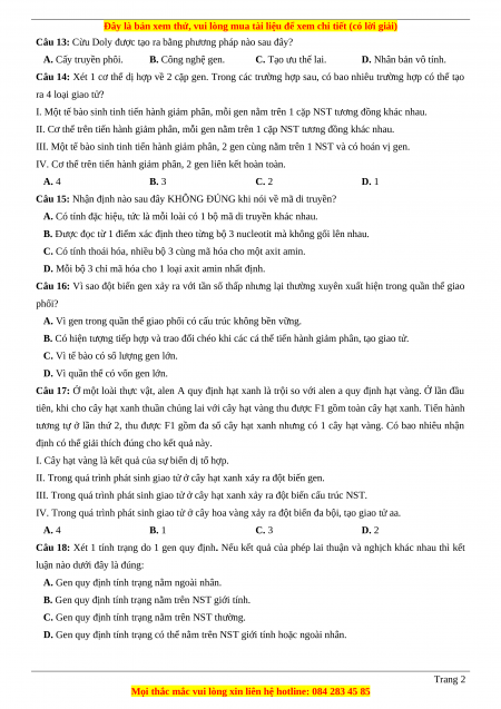 Câu 14: Xét 1 cơ thể dị hợp về 2 cặp gen. Trong các trường hợp sau, có bao nhiêu trường hợp có thể tạo