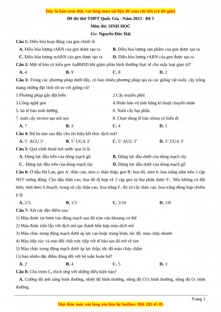Đề thi thử THPT Quốc Gia - Năm 2023 - Đề 5 Môn thi: SINH HỌC