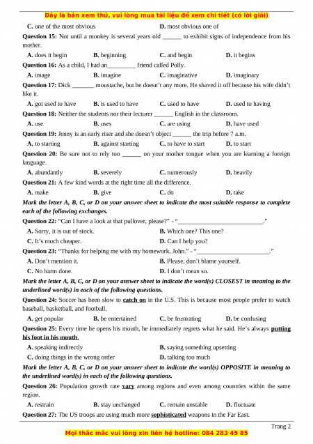 Question 19: Jenny is an early riser and she doesn’t object ______ the trip before 7 a.m. A. to starting B. against starting C. to have to start D. to start