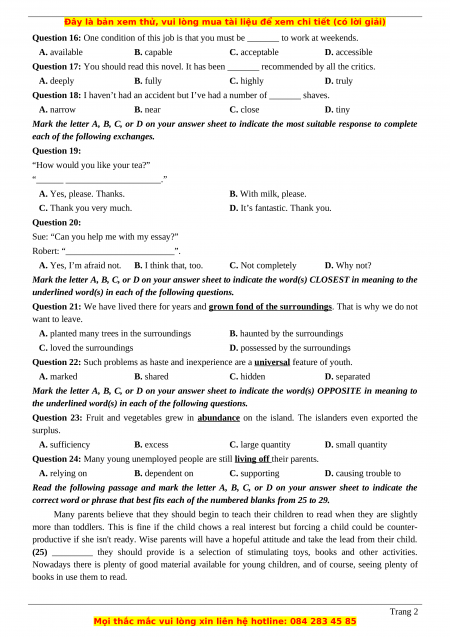 Question 16: One condition of this job is that you must be _______ to work at weekends. A. available B. capable C. acceptable D. accessible