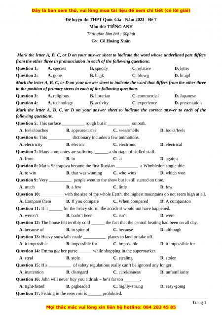 Đề luyện thi THPT Quốc Gia - Năm 2023 - Đề 7 Môn thi: TIẾNG ANH