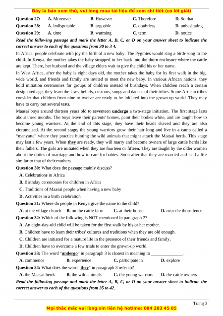 Question 27: A. Moreover B. However C. Therefore D. So that
