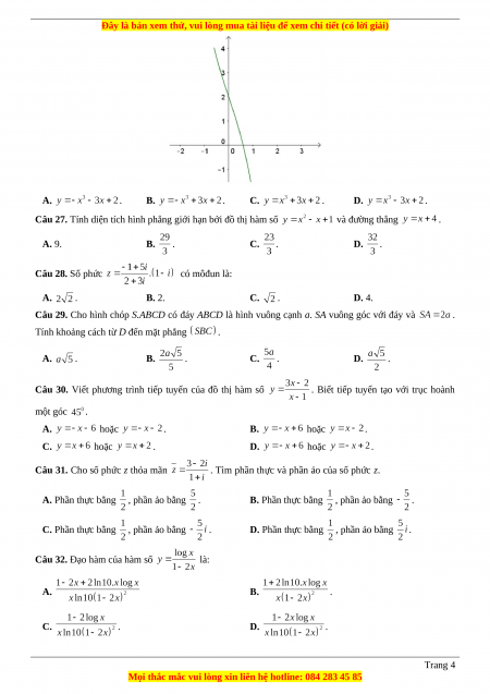 Câu 27. Tính diện tích hình phẳng giới hạn bởi đồ thị hàm số và đường thẳng . A. 9. B. . C. . D. . Câu 28. Số phức có môđun là: A. . B. 2. C. . D. 4.