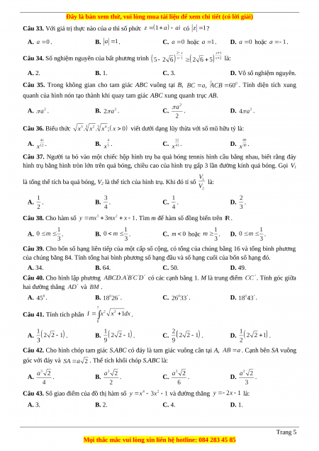 Câu 33. Với giá trị thực nào của a thì số phức có ? A. . B. . C. hoặc . D. hoặc .