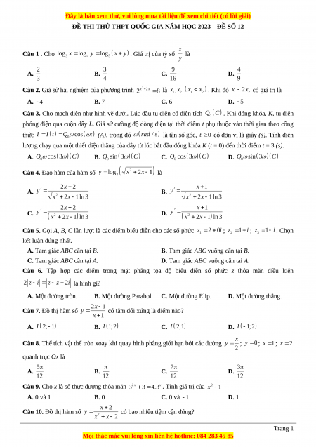 ĐỀ THI THỬ THPT QUỐC GIA NĂM HỌC 2023 – ĐỀ SỐ 12 Câu 1 . Cho . Giá trị của tỷ số là A. B. C. D.