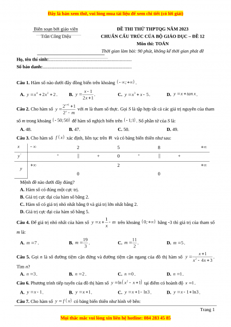 Đề thi thử THPT Quốc Gia môn Toán có đáp án (đề 12 ) - thầy Trần Công Diệu