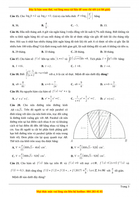nhiều hơn 100 triệu đồng? Giả định trong suốt thời gian gửi, lãi suất không đổi và anh A không rút tiền ra. A. 29 tháng. B. 33 tháng. C. 28 tháng. D. 30 tháng. Câu 17. Cho hàm số liên tục trên và . Tích phân bằng: A. . B. . C. . D. . Câu 18. Biết