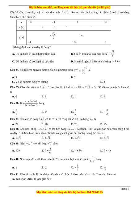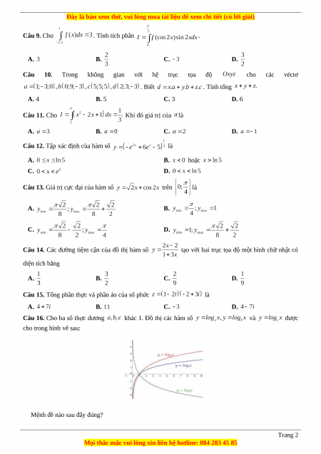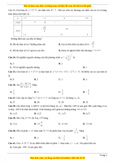 C. Vô số nghiệm nguyên dương D. 1 Câu 35. Cho hàm số có đạo hàm là