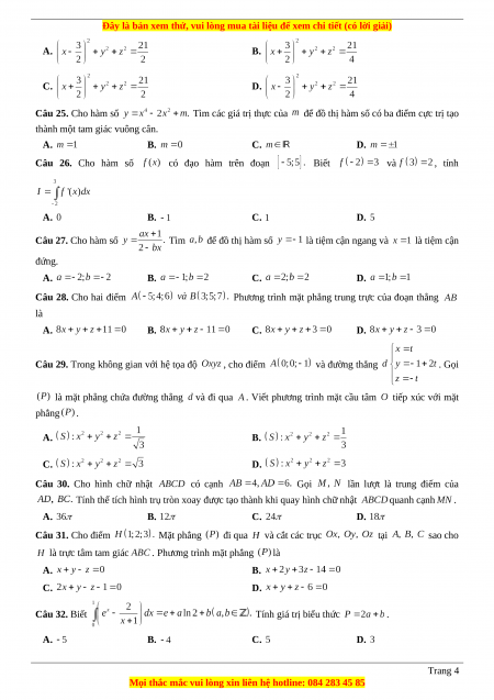 . Phương trình mặt phẳng là A. B. C. D. Câu 32. Biết