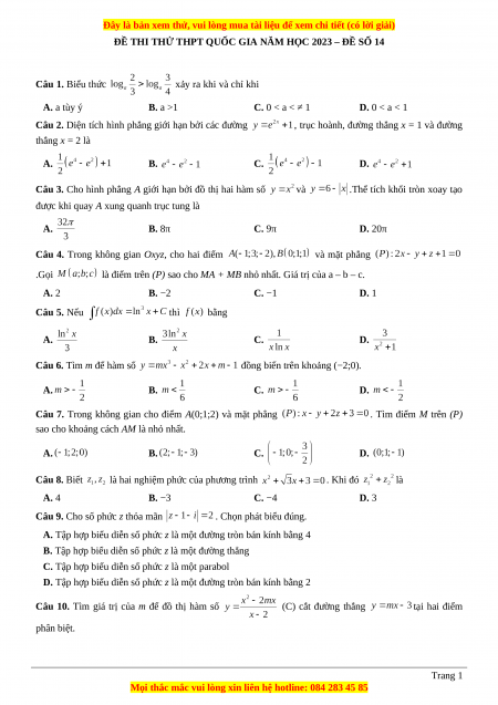 ĐỀ THI THỬ THPT QUỐC GIA NĂM HỌC 2023 – ĐỀ SỐ 14 Câu 1. Biểu thức xảy ra khi và chỉ khi A. a tùy ý B. a >1 C. 0 < a < ≠ 1 D. 0 < a < 1