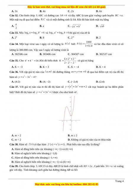 lượng là 300.000 con. Vậy sau 5 ngày số lượng virút là A. 302506 con B. 303406 con C. 304507 con D. 302537 con Câu 35. Cho .Khi đó biểu thức có giá trị bằng A. K = −3 B. K = 3 C. K = −4 D. K = 4