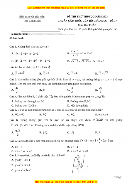 - Bộ 17 đề thi THPT Quốc gia môn Toán năm 2022-2023 có lời giải chi tiết được thầy Trần Công Diệu biên soạn công phu bám sát đề thi minh họa của Bộ GD&ĐT.