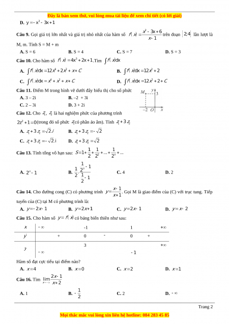 Câu 9. Gọi giá trị lớn nhất và giá trị nhỏ nhất của hàm số trên đoạn lần lượt là M, m. Tính S = M + m A. S = 6 B. S = 4 C. S = 7 D. S = 3 Câu 10. Cho hàm số .Tìm A. B. C. D.