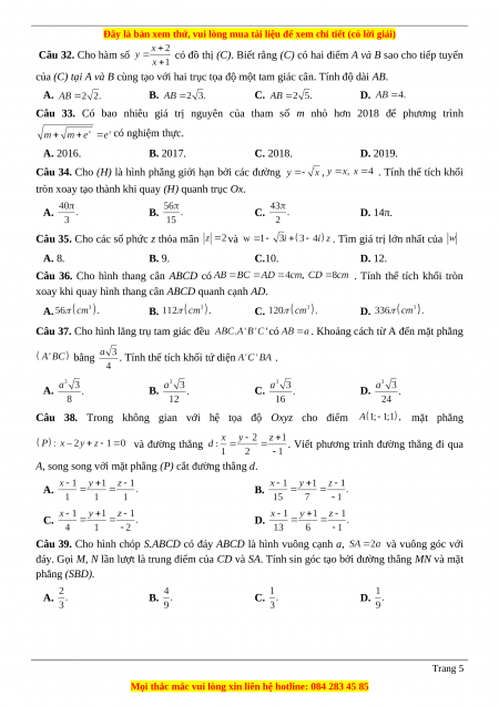 Câu 32. Cho hàm số có đồ thị (C). Biết rằng (C) có hai điểm A và B sao cho tiếp tuyến