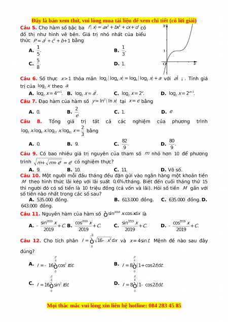 đồ thị như hình vẽ bên. Giá trị nhỏ nhất của biểu thức bằng A. B. C. D. Câu 6. Số thực thỏa mãn với Tính giá trị của theo A. B. C. D.