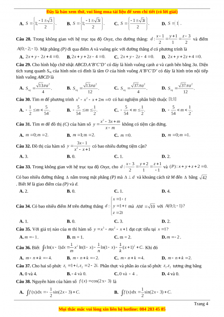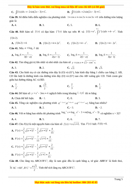 Câu 35. Với giá trị nào của m thì hàm số đạt cực tiểu tại A. . B. m = 1. C. m = 2. D. . Câu 36. Biết Khi đó A. B. C. D.
