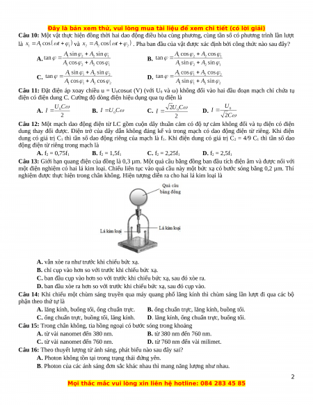 Câu 10: Một vật thực hiện đồng thời hai dao động điều hòa cùng phương, cùng tần số có phương trình lần lượt là và