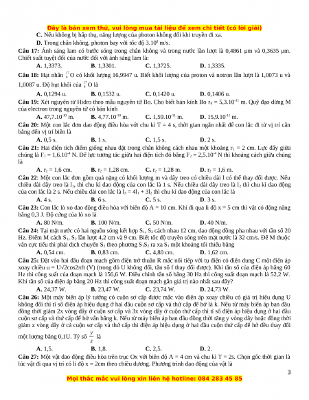 Câu 17: Ánh sáng lam có bước sóng trong chân không và trong nước lần lượt là 0,4861 μm và 0,3635 μm.