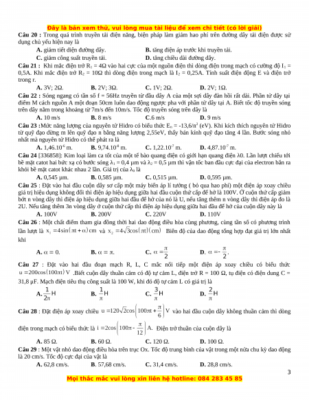 Câu 20 : Trong quá trình truyền tải điện năng, biện pháp làm giảm hao phí trên đường dây tải điện được sử