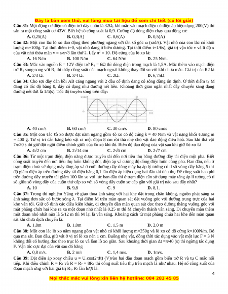Câu 31: Một động cơ điện có điện trở dây cuốn là 32Ω, khi mắc vào mạch điện có điện áp hiệu dụng 200(V) thì