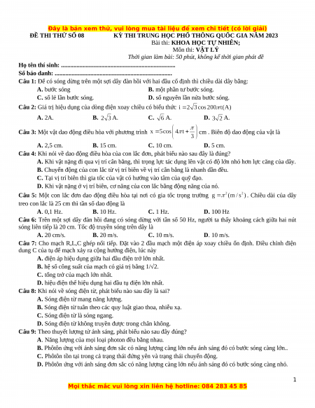 Câu 6: Trên một sợi dây đàn hồi đang có sóng dừng với tần số 50 Hz, người ta thấy khoảng cách giữa hai nút
