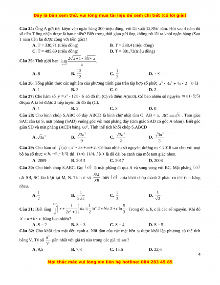 Câu 24: Ông A gửi tiết kiệm vào ngân hàng 300 triệu đồng, với lãi suất 12,8%/ năm. Hỏi sau 4 năm thì
