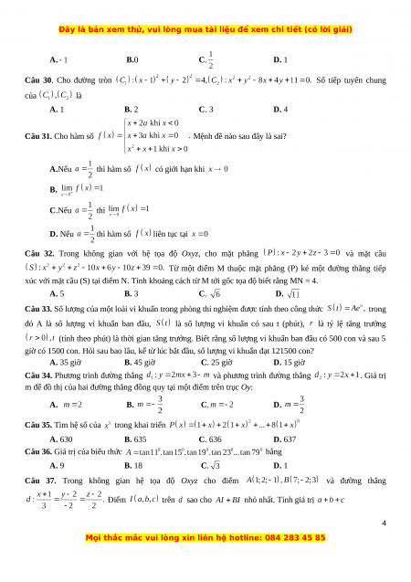 Câu 30. Cho đường tròn Số tiếp tuyến chung của là A. 1 B. 2 C. 3 D. 4 Câu 31. Cho hàm số