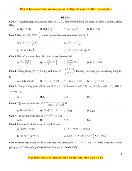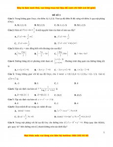 Câu 1: Trong không gian Oxyz, cho điểm A(-1;2;3). Tìm tọa độ điểm B đối xứng với điểm A qua mặt phẳng