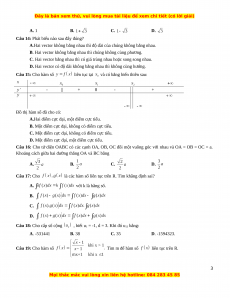 Câu 1: Trong không gian Oxyz, cho điểm A(-1;2;3). Tìm tọa độ điểm B đối xứng với điểm A qua mặt phẳng (Oxy). A. B(-1;2;-3) B. B(1;2;3) C. B(-1;-2;-3) D. B(1;-2;3) Câu 2: Hàm số