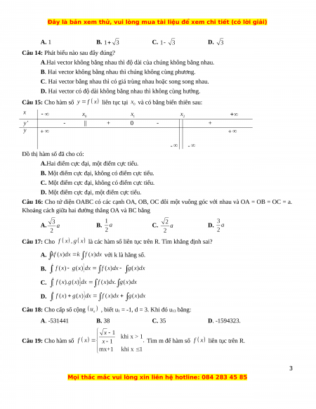 , biết u1 = -1, d = 3. Khi đó u13 bằng: A. -531441 B. 38 C. 35 D. -1594323. Câu 19: Cho hàm số Tìm m để hàm số liên tục trên R. 3