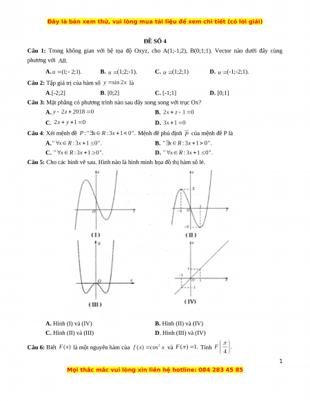 Câu 5: Cho các hình vẽ sau. Hình nào là hình minh họa đồ thị hàm số lẻ. A. Hình (I) và (IV) B. Hình (II) và (IV) C. Hình (II) và (III) D. Hình (III) và (IV) Câu 6: Biết là một nguyên hàm của và Tính 1