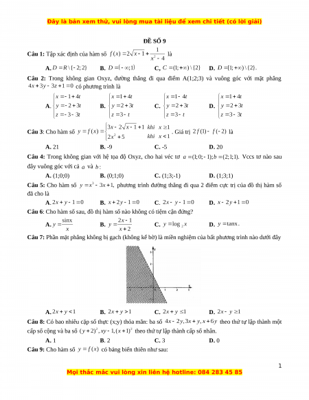 Câu 2: Trong không gian Oxyz, đường thẳng đi qua điểm A(1;2;3) và vuông góc với mặt phẳng có phương trình là A. B. C. D. Câu 3: Cho hàm số . Giá trị là A. 21 B. -9 C. -5 D. 20