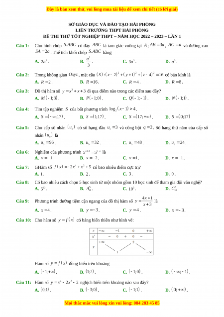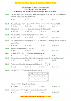 Đề thi thử Toán Liên trường Hải Phòng lần 1 năm 2023