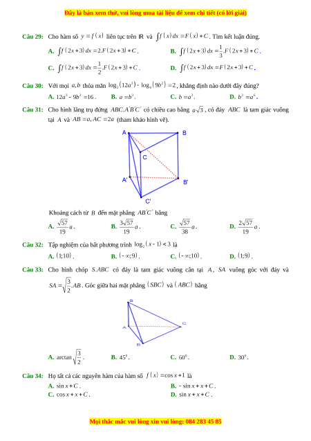 Câu 34: Họ tất cả các nguyên hàm của hàm số là A. . B. . C. . D. .