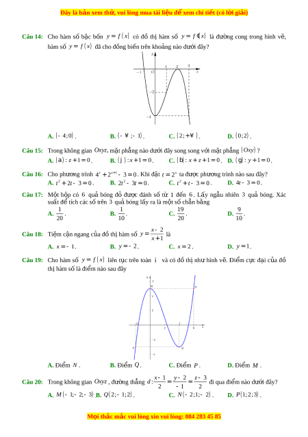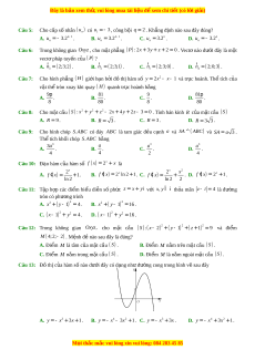 ố rên 3 quả bóng lấy ra là m t ộ s c ố hẵn bằng 1 1 19 9 A. . B. . C. . D. . 20 10 20 10 x - 2 Câu 18: Ti m ệ cận ngang c a ủ đ t ồ hị hàm s ố y = là x 1 + A. x =- 1. B. y =- 2 . C. x = 2 . D. y =1.